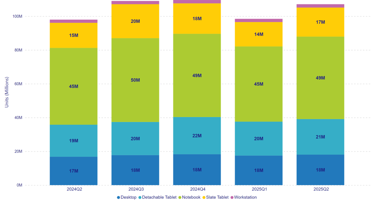 PCD market posted growth of 9.3% in the second quarter of 2025 (2Q25) from the prior year, with global volumes reaching 107.1 million shipments. PC market grew by 7.3% year-over-year with shipments totaling 107.1 million units and tablet market grew by 13.1% with shipments totaling 38.3 million units. While both PC and tablet markets continue to grow, the US market is starting to feel the pinch of import tariffs.